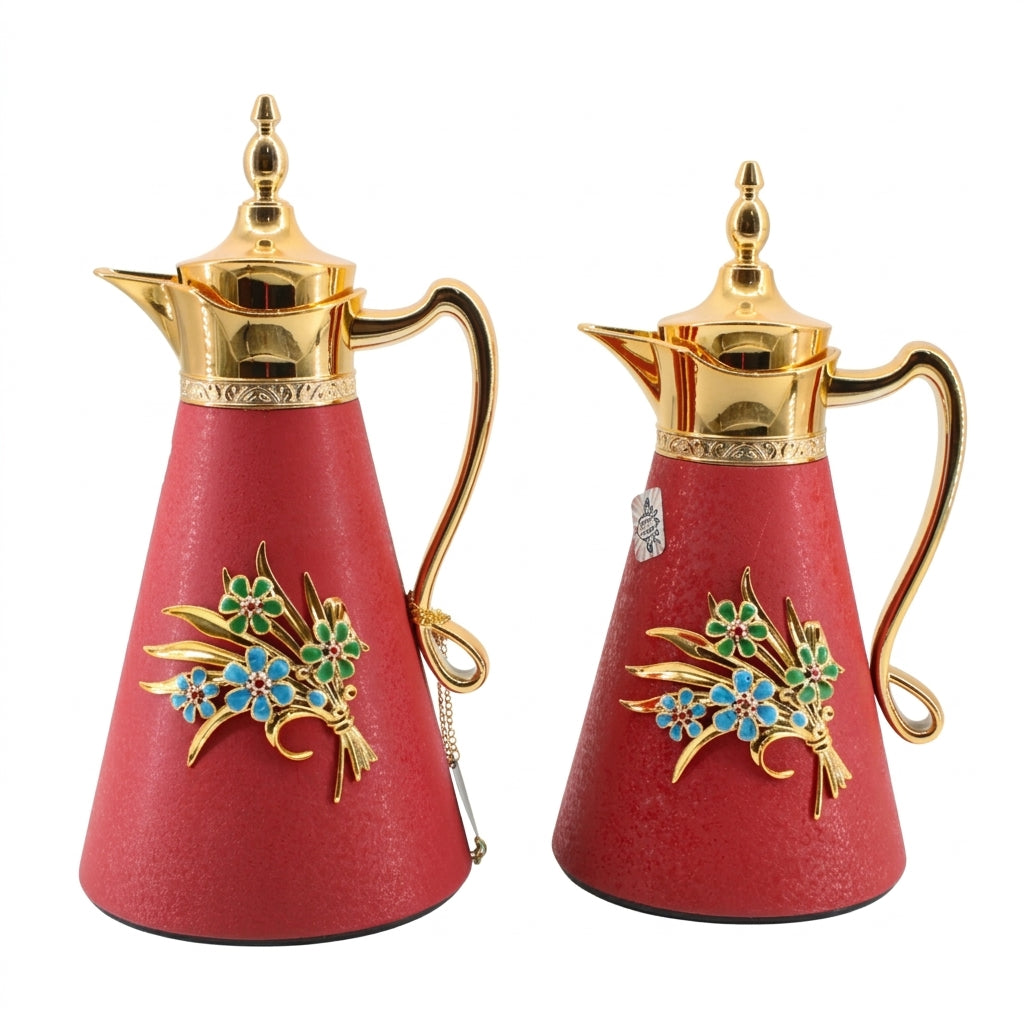 2-Piece Red Vacuum Flask Set (0.7L + 1.0L) with Gold Handle & Floral Accent